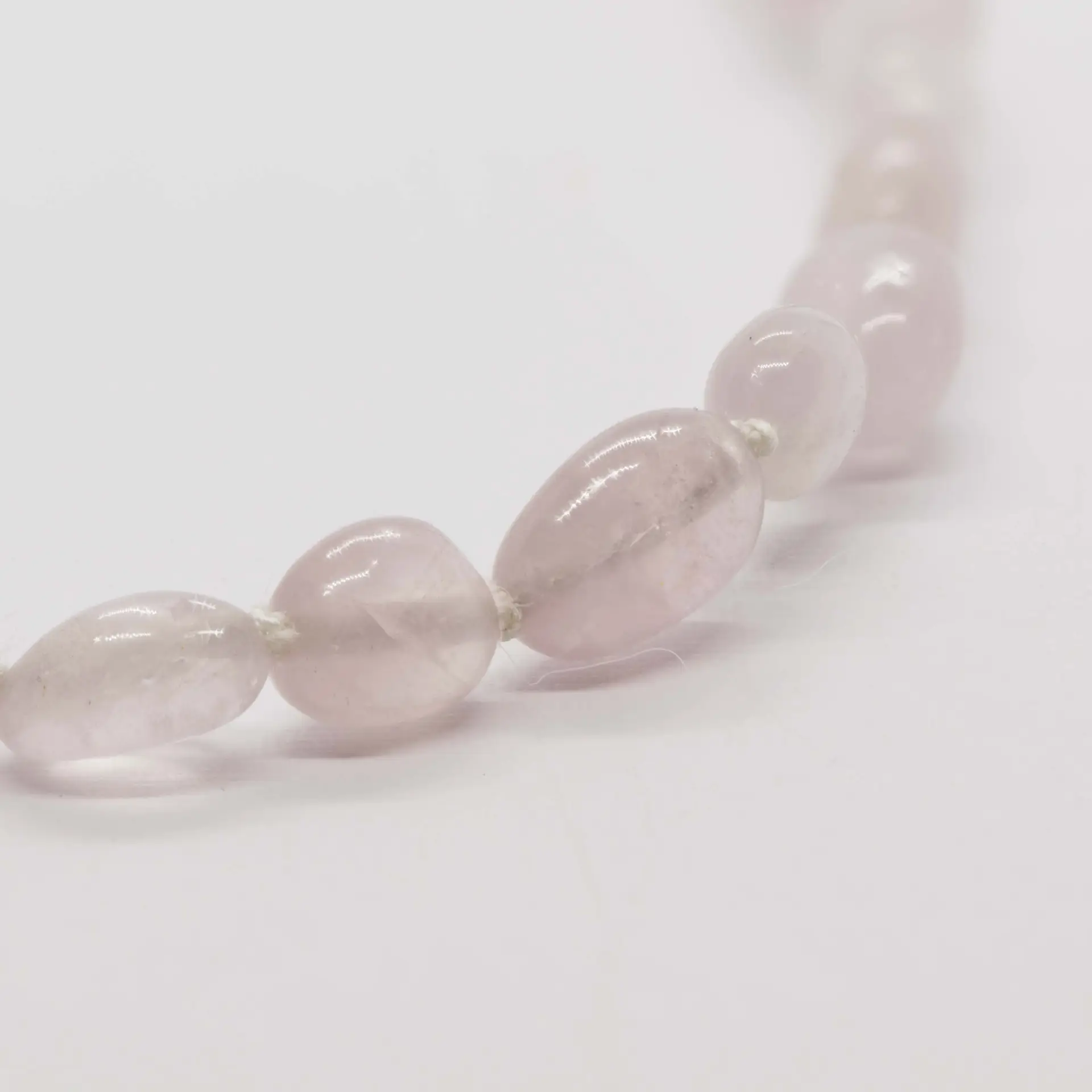 Elke kraal werd zorgvuldig met de hand geknoopt, waardoor de ketting een verfijnde souplesse krijgt en de unieke vormen en kleurgradaties van de roze kwarts ten volle tot hun recht komen.