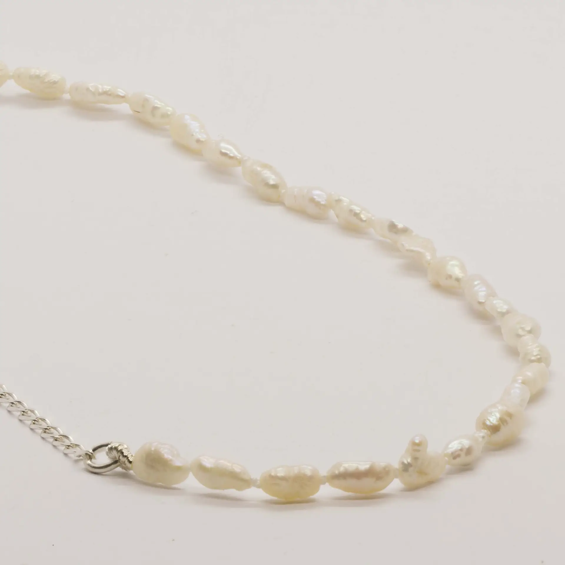 Een spel van lichtheid en elegantie – Tides of Grace is een moderne interpretatie van klassieke parels. De ene helft van de halsketting bestaat uit fijne, natuurlijk gevormde rijstparels die stuk voor stuk met de hand zijn geknoopt. De andere helft is een elegante zilveren ketting die de compositie luchtig en eigentijds maakt.