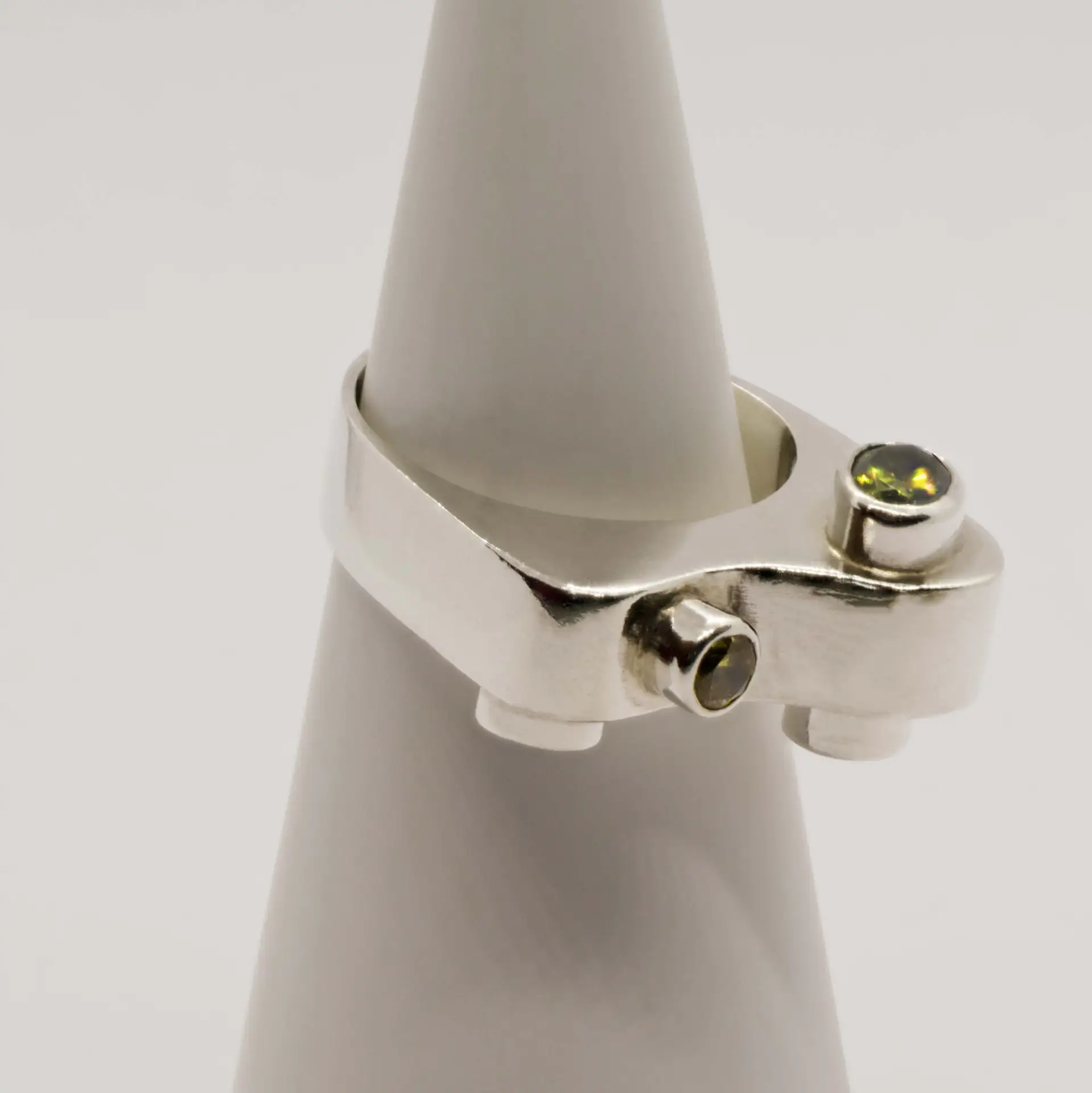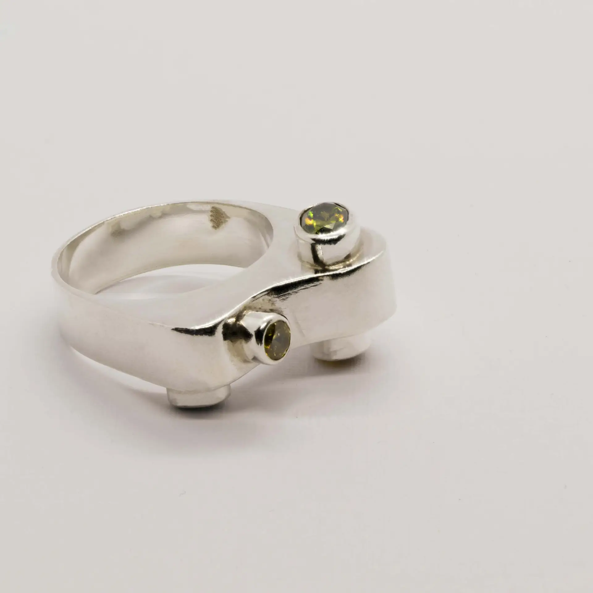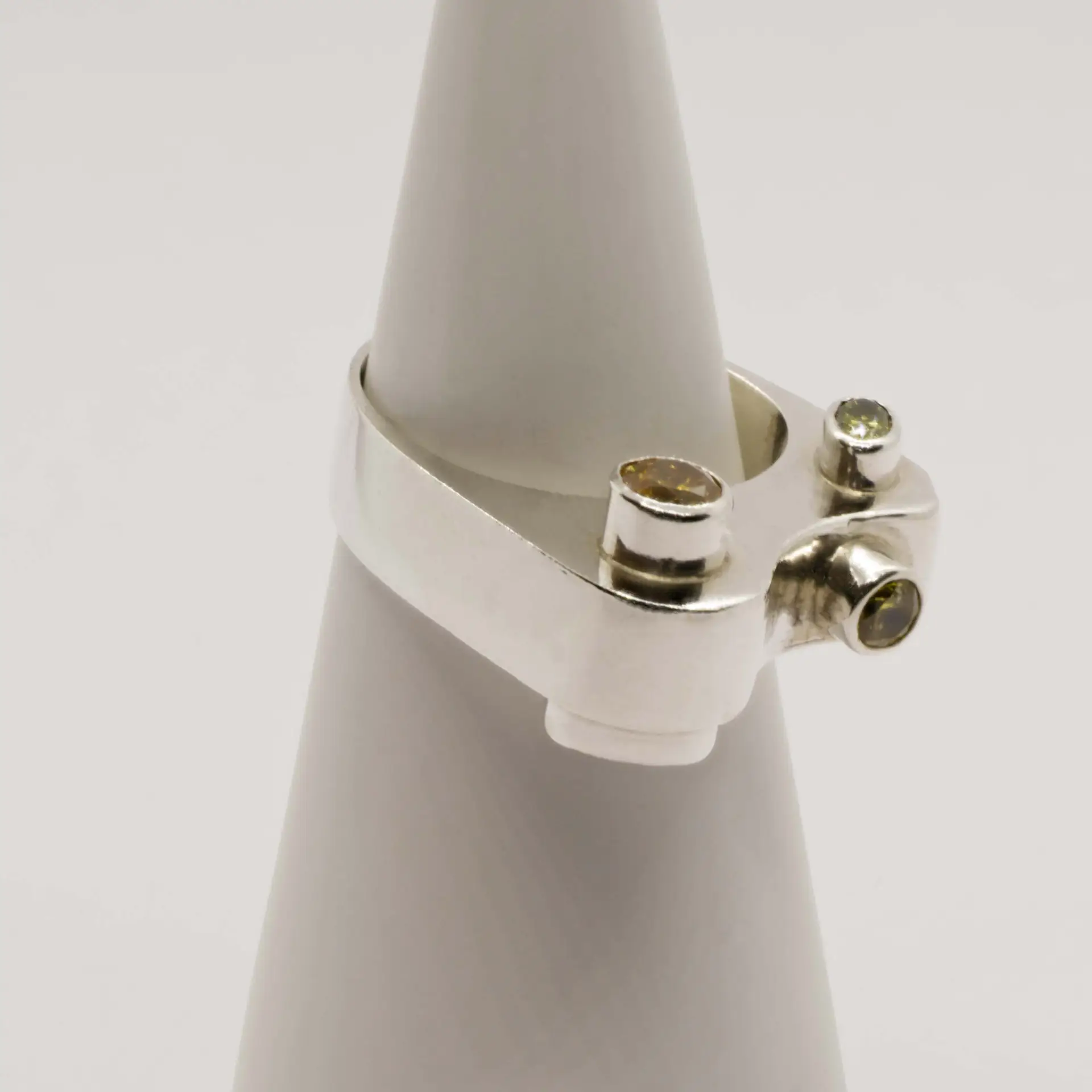 Vier zirkonia’s (geel en olijfgoen) in kastzetting (2 ronde van 4 en 5 mm en 2 ovalen van 3*5 en van 5*7 mm facet geslepen)