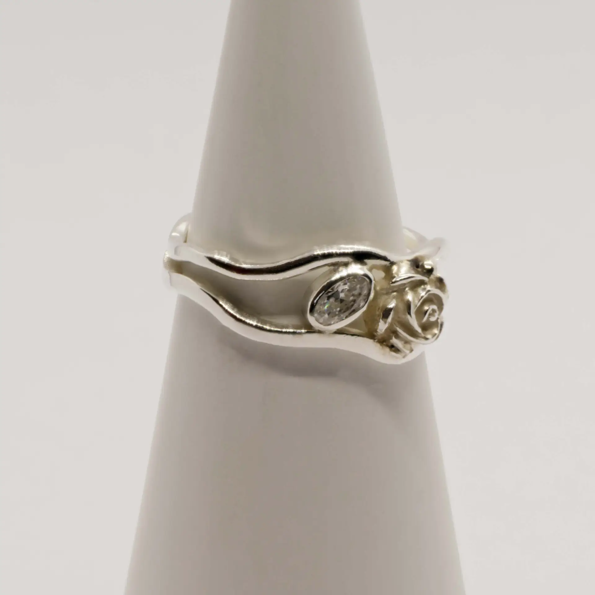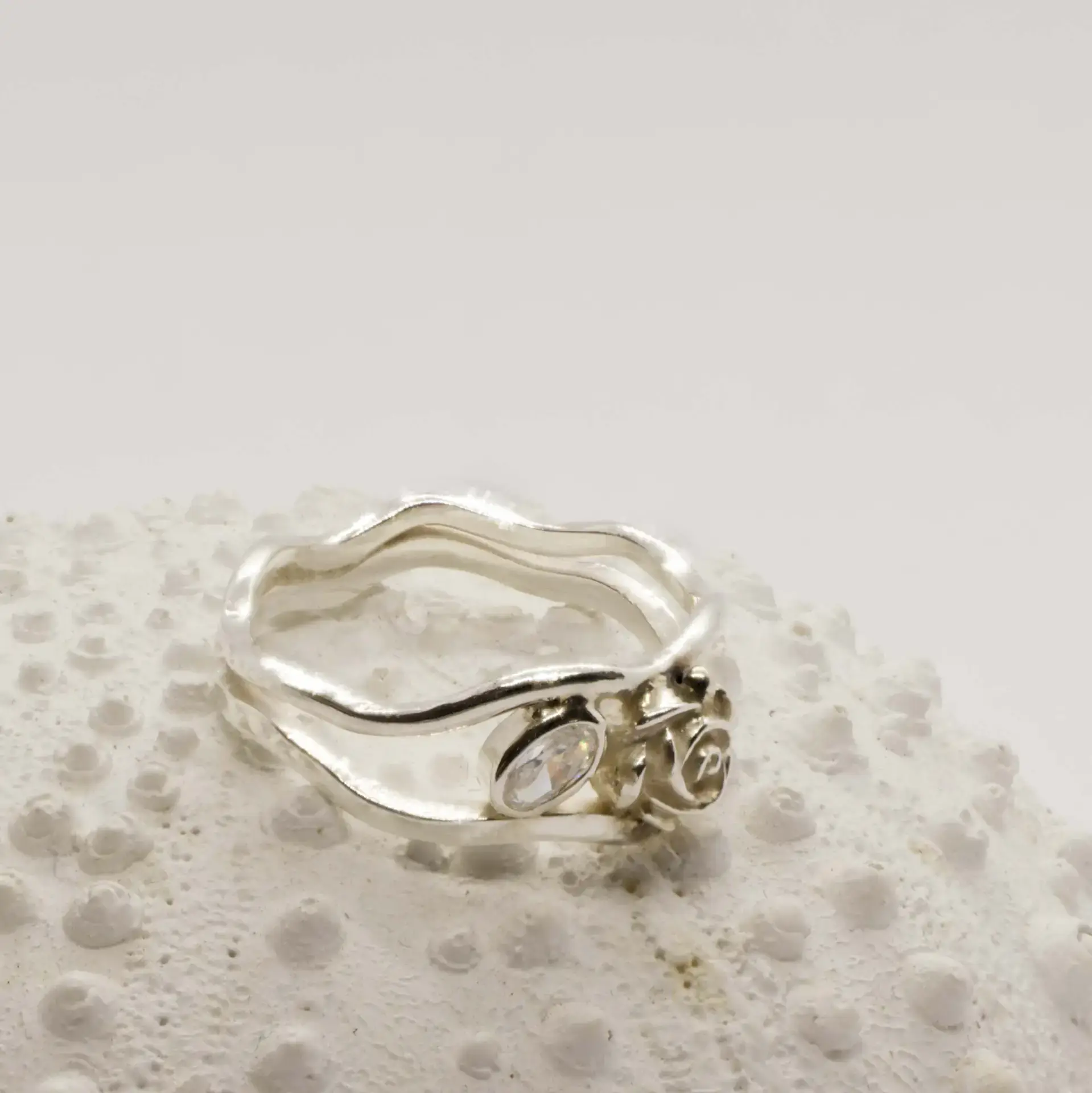 Verbinding in haar puurste vorm. Lia Rosa is een verfijnde zilveren ring met twee speels gevormde ringbanden die samenkomen in een teder detail: een handgemaakt bloemetje en een heldere zirkonia, als een bloesemdruppel die het licht vangt.